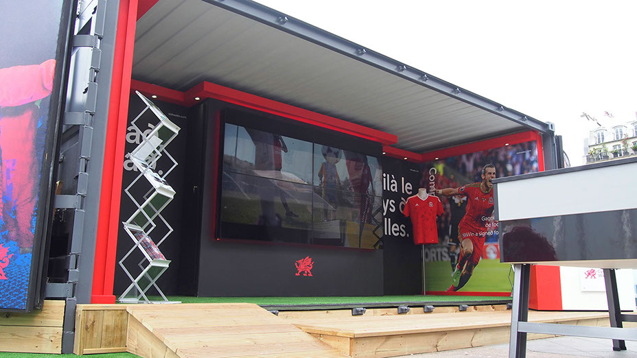 Designed by Open Space Creative primarily to raise awareness of Wales to change perceptions and present Wales as a leading adventure destination during 2016 in the context of Euro 2016. The stand featured a shipping container fitted with internal graphics, a monitor wall and exterior attractions and activities which resulted in over 94,000 visitors to the stand over a three week period.