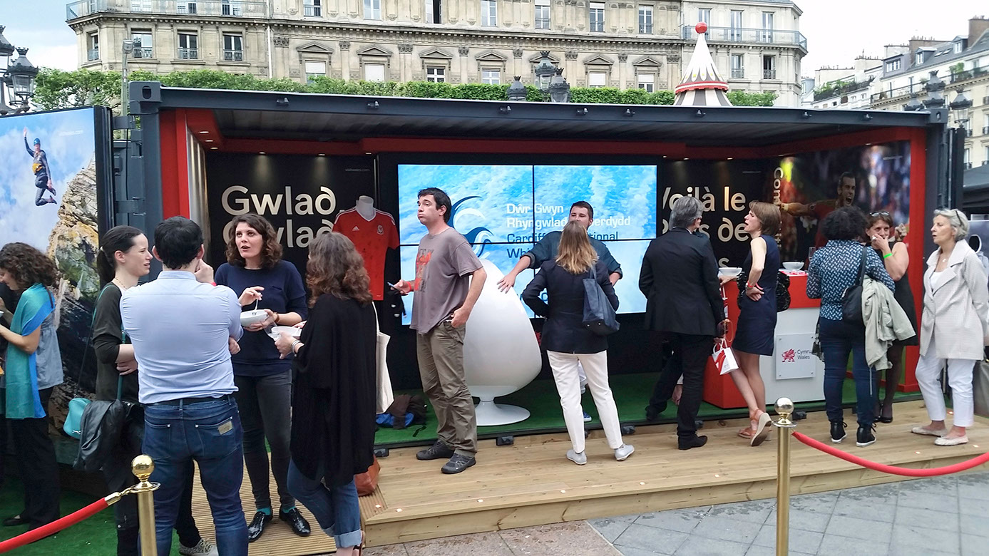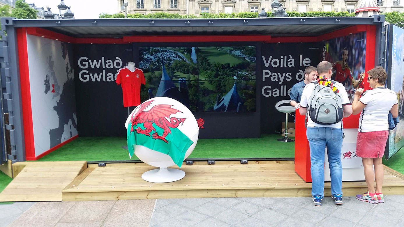 Designed by Open Space Creative primarily to raise awareness of Wales to change perceptions and present Wales as a leading adventure destination during 2016 in the context of Euro 2016. The stand featured a shipping container fitted with internal graphics, a monitor wall and exterior attractions and activities which resulted in over 94,000 visitors to the stand over a three week period.