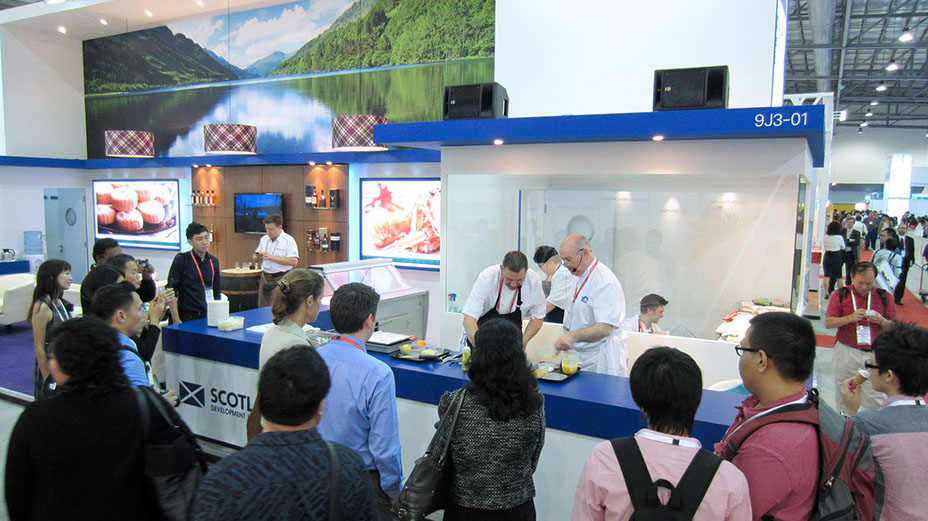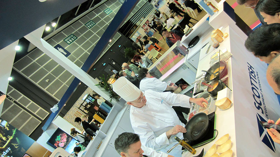 Working closely with our client our design team made full use of available exhibition space to maximize brand and marketing potential for Scottish Enterprise and its assortment of participating partners. To entice visitors to the stand we incorporated a food servery feature area that included a fully equipped kitchen and preparation area for the chefs to use.